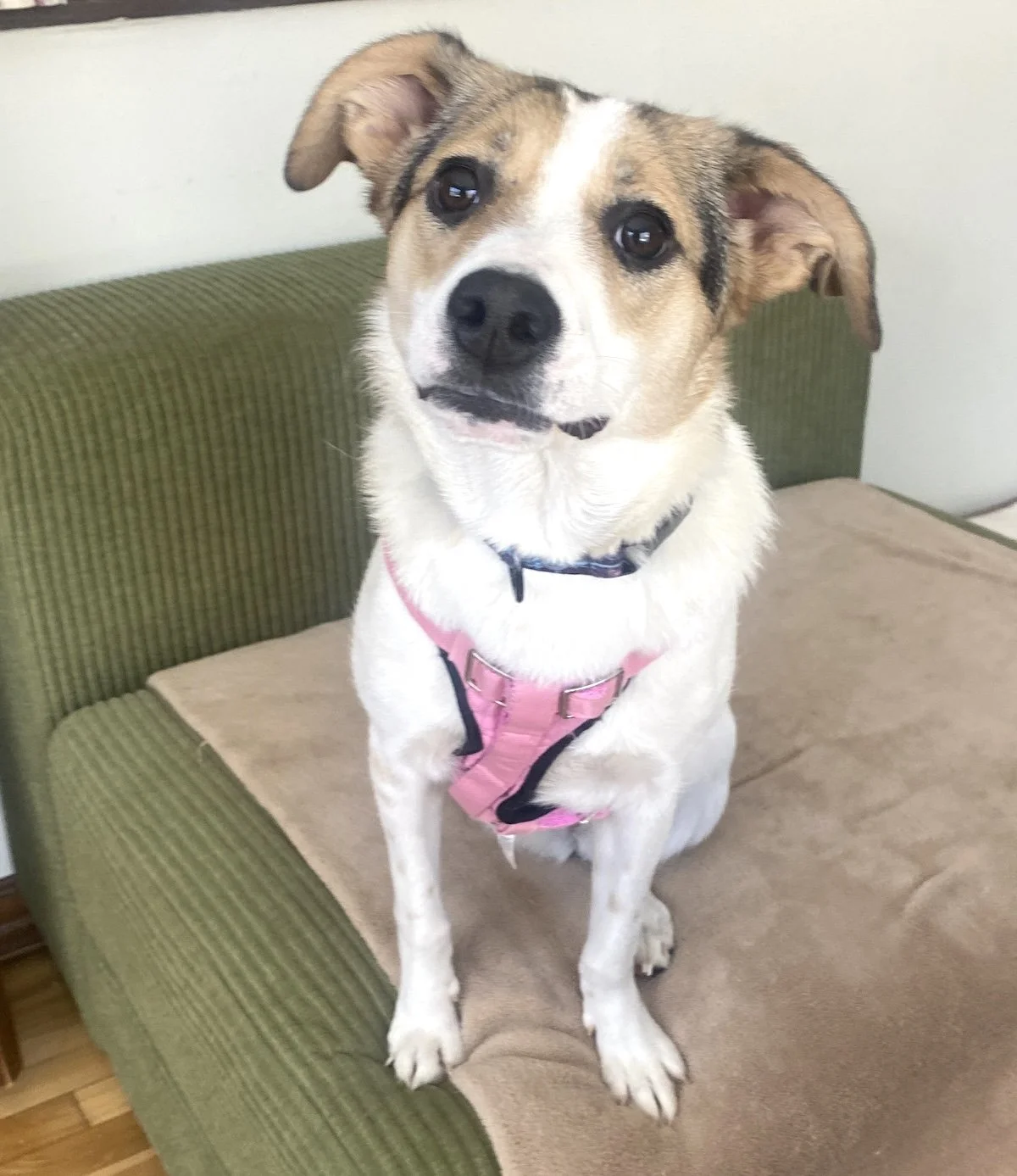 Cassie is a sweet, goofy, cheerful girl with big, expressive eyes that seem to smile at you. She is house-trained, loves cuddles, and plays with toys. Her foster says she’s kind, funny, affectionate, and very smart. Cassie is a true little adventure buddy. She loves walks, walks nicely on a leash, and thinks car rides are the best thing ever.