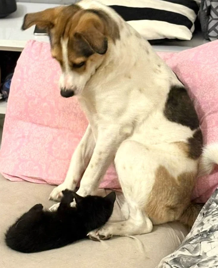 Cassie gets along well with other dogs, but her very best friend is a small black kitten. They’re together all the time, playing, eating, and sharing a bed.
